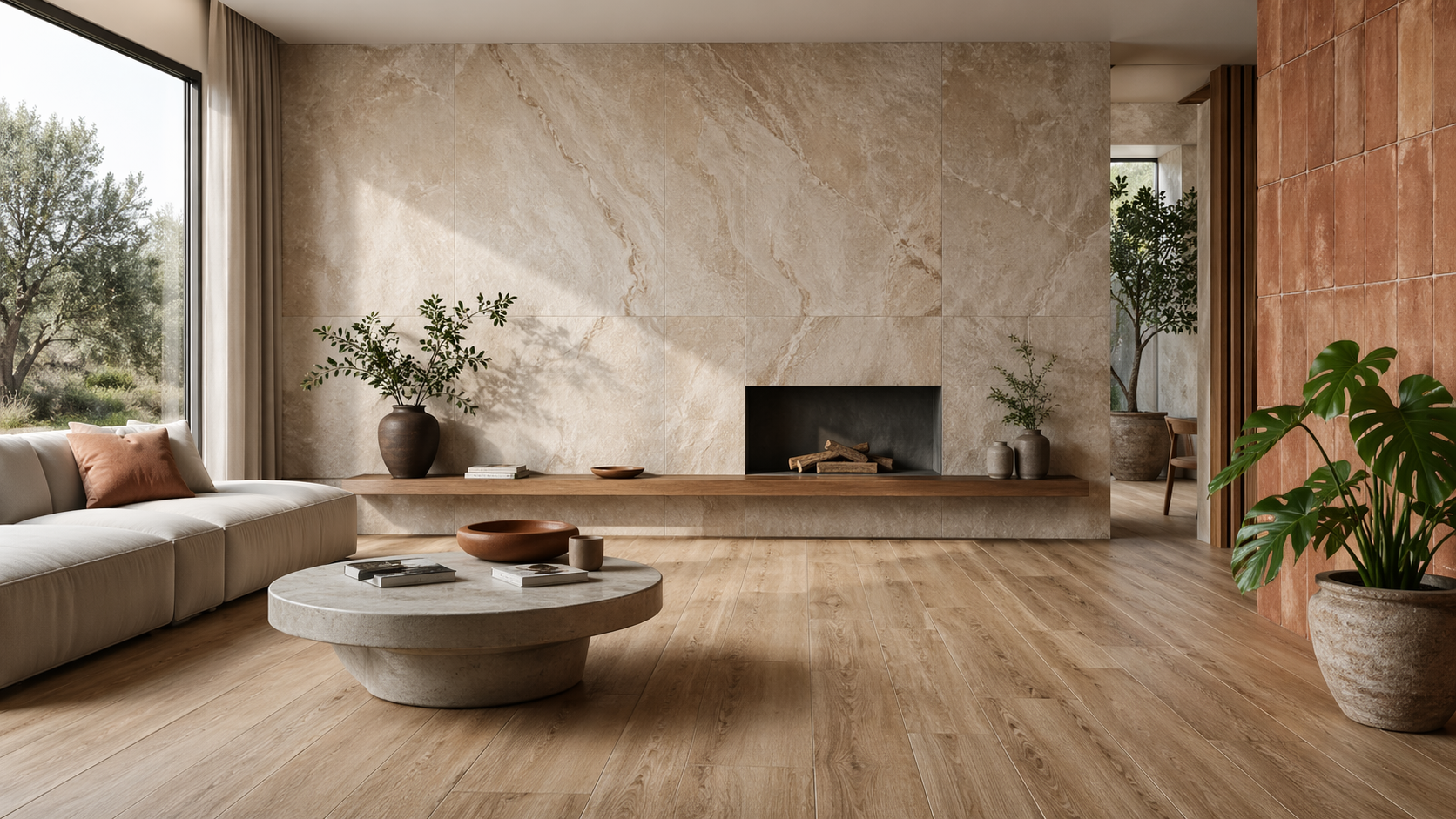 Отдельное направление — имитация природных поверхностей в более широком смысле. Песок, глина, бетон, скала — всё это также отражение природной среды, пусть и в переработанном виде. Такие коллекции часто используют мягкие, приглушённые оттенки: бежевые, серые, терракотовые. Они создают спокойный фон, на котором легко строить интерьер, не перегружая его деталями. В результате пространство выглядит естественно и гармонично.